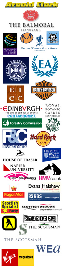 A Arnold Clark B Balmoral Hotel D Dynamic Earth E Eastern Western Motor group Edinburgh Academy Edinburgh Council Edinburgh Harley Davidson Edinburgh International Conference centre Edinburgh Royal Botanical Gardens F F&C Asset Management Forestry Commission H HardRock Cafe Heriot Watt University House of Frasers HMV M Marco's Leisure Murrayfield Golf Course N Napier University Next Generation Clubs P Portaprompt R Reg Vardy Royal Bank of Scotland Royal Mail S Scottish Socialist Party Scottish Widows Studio24 T The Scotsman The Scotsman Hotel U University of Edinburgh V Virgin Megastores W WEA Y Yellow Pages